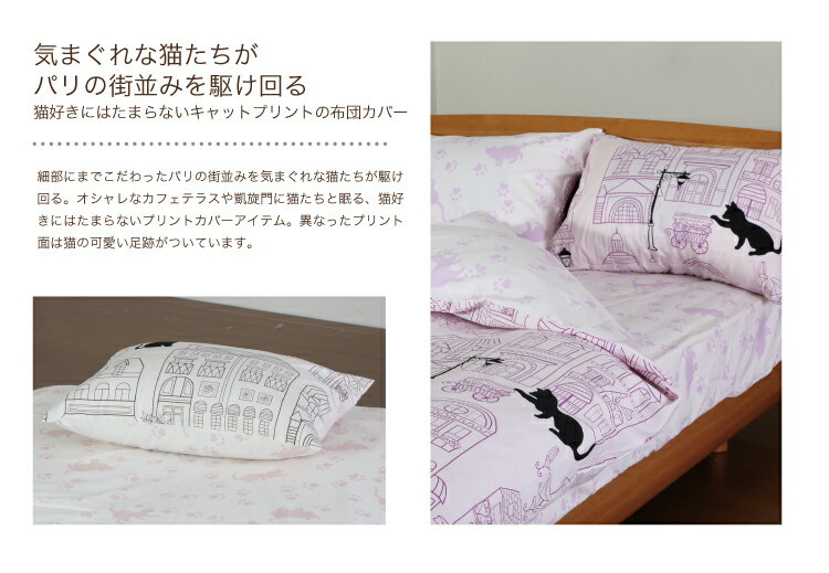 パリの街並みを散歩する黒猫が可愛い!枕カバー/43×63cm/女性らしいおしゃれな猫柄カバー/リバーシブルで使える/安心の日本製/肌に優しい綿100%/Meets(ミーツ)